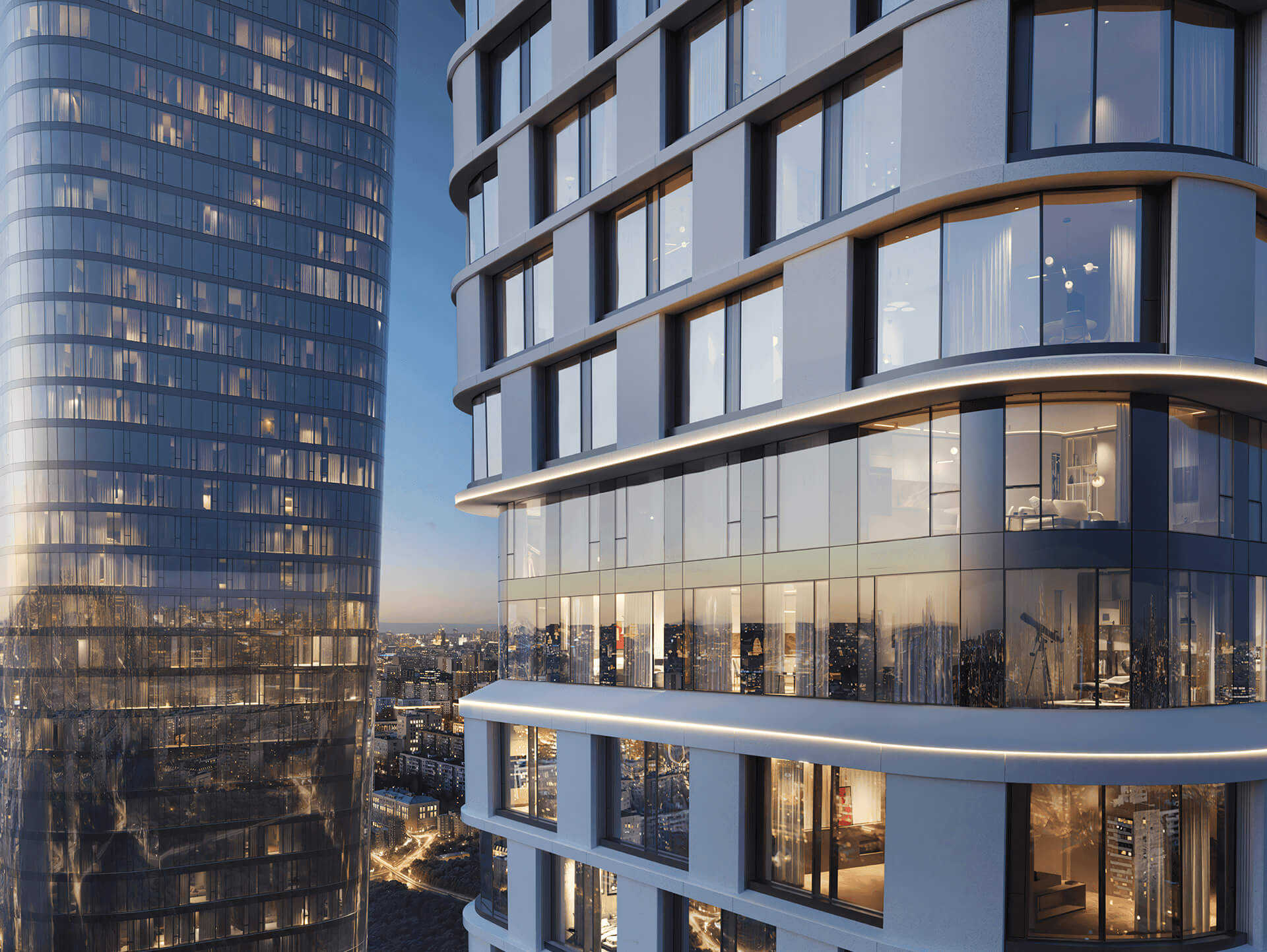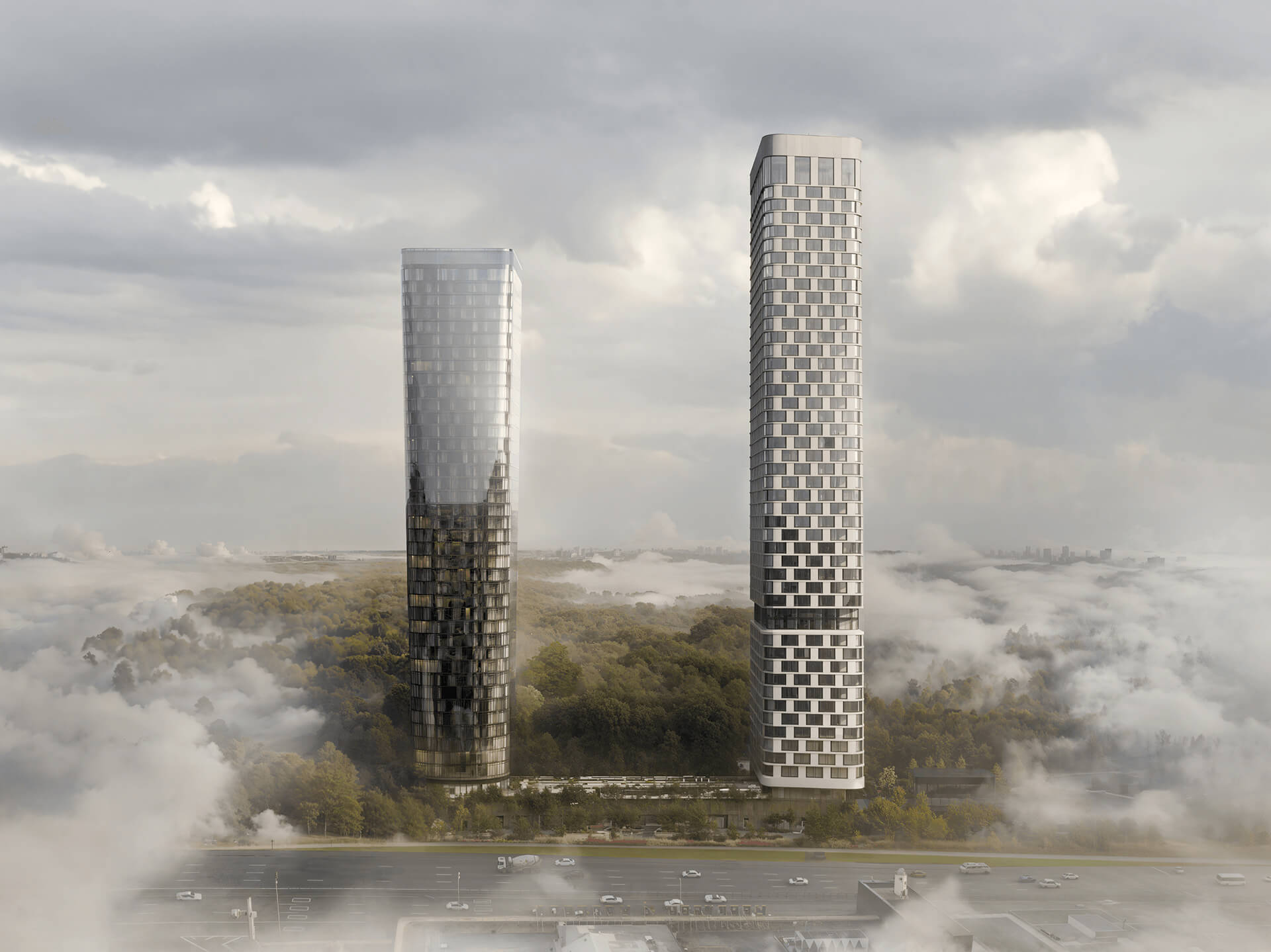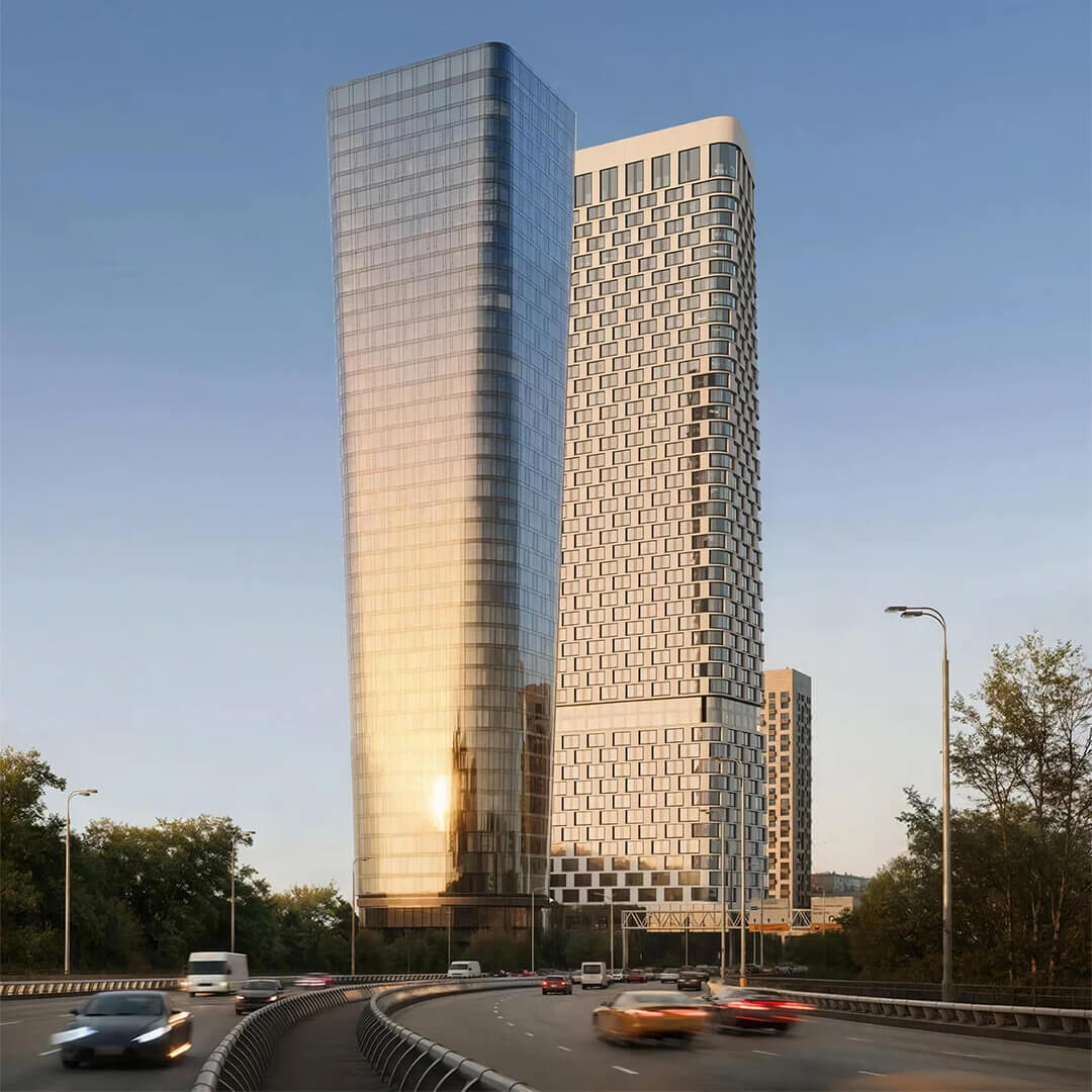 Архитектура жилого комплекса SOLOS — это воплощение современного дизайна, функциональности и эстетики. Две башни комплекса, выполненные в стиле чувственного функционализма, отличаются плавными линиями, полностью стеклянными фасадами и панорамными окнами, создающими ощущение воздушности и прозрачности. Архитекторы бюро Kleinewelt Architekten уделили особое внимание деталям, чтобы подчеркнуть легкость и простор пространства.